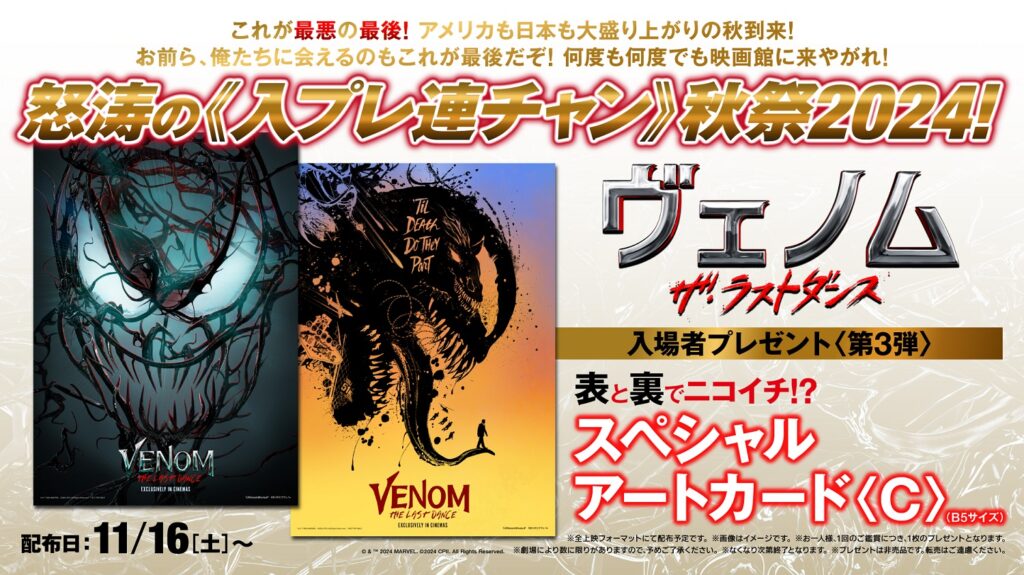 大好評の「これが<最悪>の最後!アメリカも日本も大盛り上がりの秋到来!お前ら、俺たちに会えるのもこれが最後だぞ!何度も何度でも映画館に来やがれ!怒涛の《入プレ連チャン》秋祭2024」と称した連続実施中の入場者プレゼント!このたび、<第3弾>の情報が解禁となった!