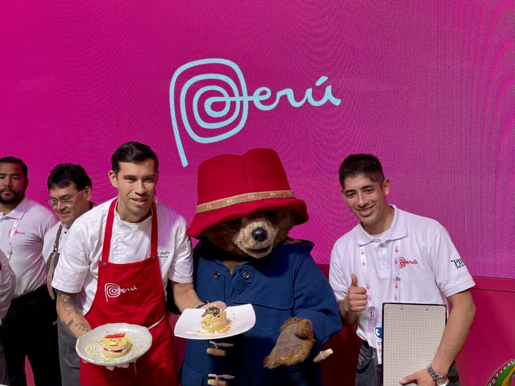 午後は、最新作の映画さながら英国(パビリオン)からペルー(館)へ。ペルー館の入口で公式スタンプパスポートに、ペルーのスタンプを押してもらい、ペルーの冒険が始まる。入ってすぐのブースでは、本作のロケ地でもある世界遺産マチュ・ピチュを空撮した壮大な光景が一面の巨大スクリーンに投影され、まるで映画のワンシーンに入り込んだかのような、大迫力の空間となった。最奥に設けられているカウンターでは、ペルーのポテトサラダ、カウサ・リメーニャのクッキングパフォーマンスが開催され、パディントンを模したオリジナルデザインのサプライズに場を和ませた。