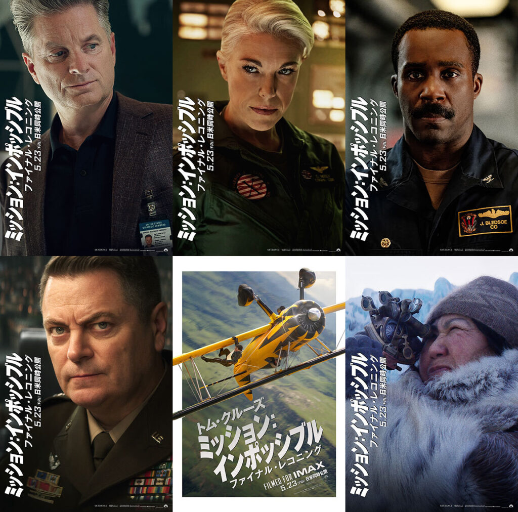 いまだヴェールに包まれている本作の物語にあっても、やはり『ミッション:インポッシブル』といえば人類誰もが信じてやまない確かなことは、トム・クルーズが再び命を懸けてスクリーンを駆け抜けるという絶大なる信頼と期待。飛行中のセスナ機の脚に生身でしがみつくイーサン(トム・クルーズ)の姿は、まさしくそれを象徴している1枚だ。お馴染みとなったIMFチーム最古参の重鎮ルーサー(ヴィング・レイムス)がかつてない厳しい視線を見せているほか、トムと共に明日5/6開催のジャパンプレミアに登場予定の4人、ベンジー(サイモン・ペッグ)が前作『デッドレコニング』から続くキーアイテムの【鍵】を手にしており重要な活躍を見せる予感が漂い、さらには前作で立ち位置の読めない登場を果たしながら最後はイーサンとの共闘で死線を潜り抜けたグレース(ヘイリー・アトウェル)の力強い表情や、サイレントキラーのような存在感とアクションシーンの唯一無二の迫力が観客の心をつかんだパリス(ポム・クレメンティエフ)には瀕死の重傷から一命をとりとめるに至った痛々しき腹の傷も見え、自身や国家にとっての正義とIMFやイーサンが世界を救うためにとる行動との信念の揺らぎに向き合うCIAエージェントのドガ(グレッグ・ターザン・デイヴィス)も、その葛藤が見え隠れするような陰影が印象的だ。