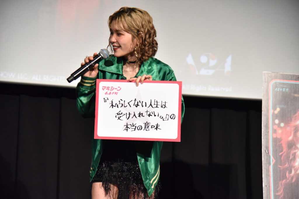 ⼀⽅、ファイルーズは「『私らしくない⼈⽣は受け⼊れない』の本当の意味」と書かれたクリップを掲げ「このワード、たびたび出てくるんですが、私はとても好きな⾔葉。役者をやっていると⾃分以外の何かであったり、みんなが求める⾃分をやらなきゃいけない時もあるんですが、この⾔葉を聞くと、すごく勇気づけられます。『MaXXXine マキシーン』を⾒た後だと解釈や捉え⽅も変わってきます。あとは、リリー・コリンズがめっちゃかわいいので、そこも注⽬してほしいです︕」とまくしたてた。