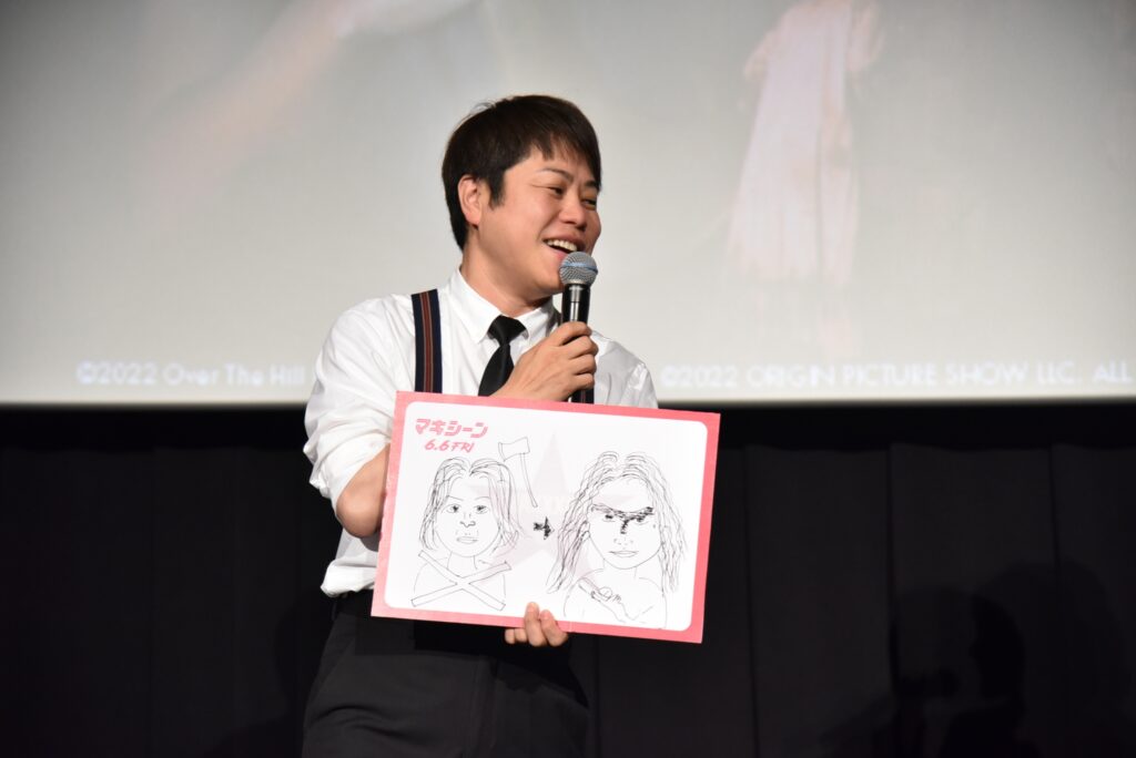 さらに、トークでは6⽉6 ⽇の“悪魔の⽇”に公開を迎える最新作にしてトリロジーの完結編となる『MaXXXine マキシーン』の魅⼒についてもたっぷりと語る。2⼈は『MaXXXine マキシーン』の魅⼒をひと⾔で伝える直筆のパネルを⽤意してきたが、井上は⽂字ではなく『X エックス』と『MaXXXine マキシーン』、それぞれの作品でのマキシーンの顔を描いたパネルを掲げ「『X エックス』と『MaXXXine マキシーン』は時系列がグッとつながります。『X エックス』でいろんなことを経験してしまったがゆえ、顔つきが変わってしまうのを⾒ていただきたいです。
