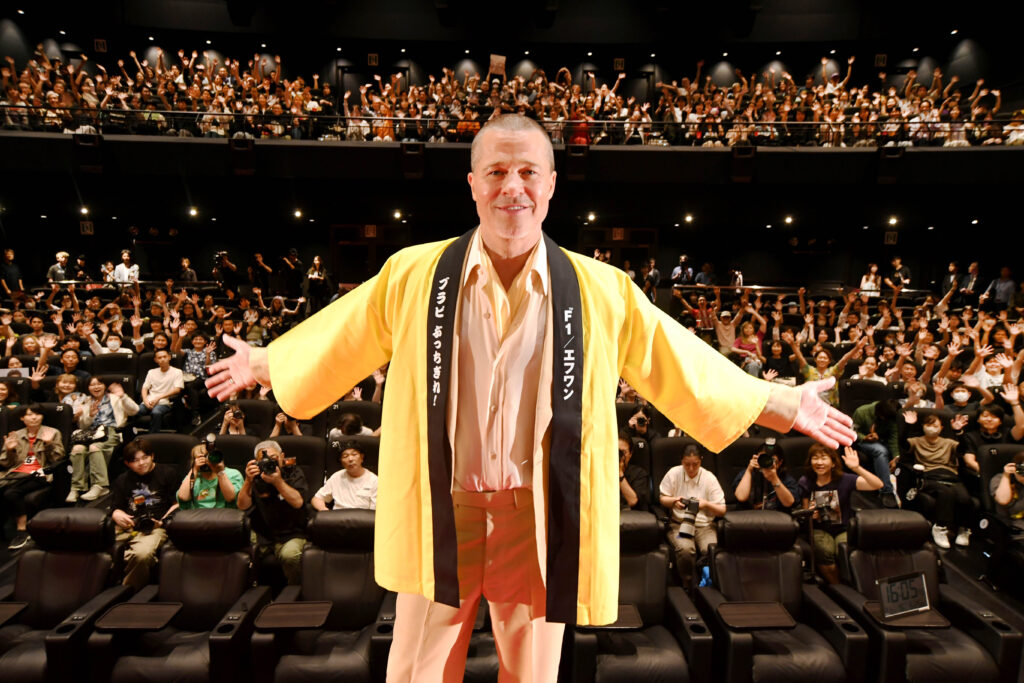 舞台挨拶の最後には、「F1®/エフワン ブラピ ぶっちぎれ!」と書かれた特製の法被を着用したブラッドが、日本の伝統文化「三本締め」に挑戦。満員の観客たちと一体となって3本締めに挑戦し、満面の笑み!