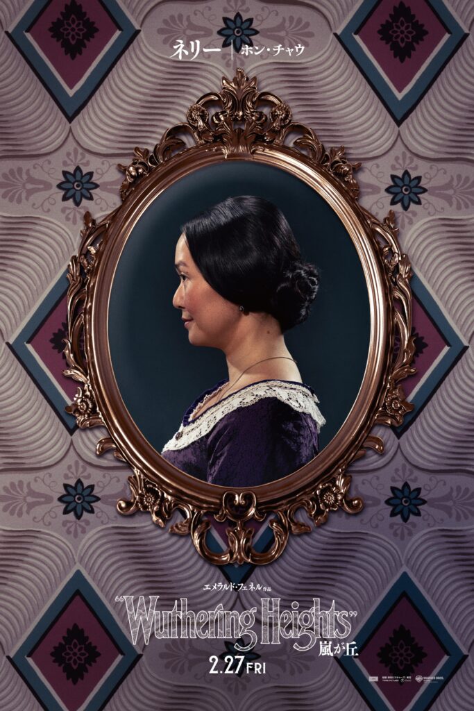 美しき令嬢キャサリン(マーゴット・ロビー)を包むのは、うっすらと血管が走る肌を思わせる柔らかなピンク。生命の生々しさと危うさが同居した、ゾッとするほど美しい色使いだ。対して、彼女と激しく惹かれ合う孤児ヒースクリフ(ジェイコブ・エロルディ)のビジュアルは、どこか悲壮感漂う深い青に染まっている。それは二人が幼少期を共に過ごした“嵐が丘”の険しい岩肌のようであり、彼が胸に秘めた孤独と、キャサリンを求め続ける激しい執念を物語っているかのようだ。キャサリンを支えながらも底知れぬ野心を覗かせる家政婦ネリー(ホン・チャウ)の背景には、その複雑な内面を象徴するように、迷宮のような不思議な模様が。キャサリンを富で魅了する富豪エドガー(シャザド・ラティフ)の背後には、混沌とした澱みが渦巻く。エドガーが妹のように大切にする純真無垢なイザベラ(アリソン・オリヴァー)は、大好きなリボンに彩られながらも、ヒースクリフという“毒”に魅入られていく崩壊を予感させる──。