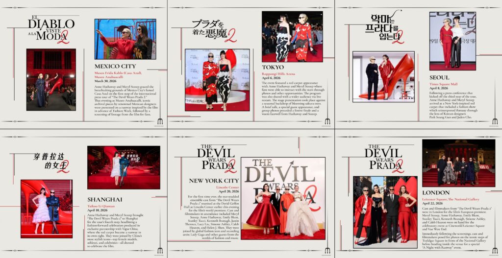 初日を飾ったメキシコシティで開催されたイベントでは、アンはピンクに輝くスパンコールが眩しい、ステラマッカートニー(STELLA McCARTNEY)のミニドレスに同ブランドのサイハイブーツ。メリルはスキャパレリ (SCHIAPARELLI)の深いネイビーのシルクドレスを着用。フロントに配されたゴールドの独創的なボタンが、メキシコの夜に映え、まさに“ファッション界の女王”ミランダ・プリーストリーにふさわしい、重厚感とモダンさが同居するスタイルを披露した。そして記念すべき初の2ショット来日を飾った東京では、アンはヴァレンティノ(VALENTINO)のオートクチュールピースを身に着け、桜吹雪に負けない美しさでファンの視線を釘付けに。メリルは燃えるような赤と、無垢な白がドラマティックに交錯するインパクト大のシャネル(CHANEL)のルックを着用し、ミランダとアンディが映画の世界から飛び出したような魅力で日本のファンを熱狂させた。