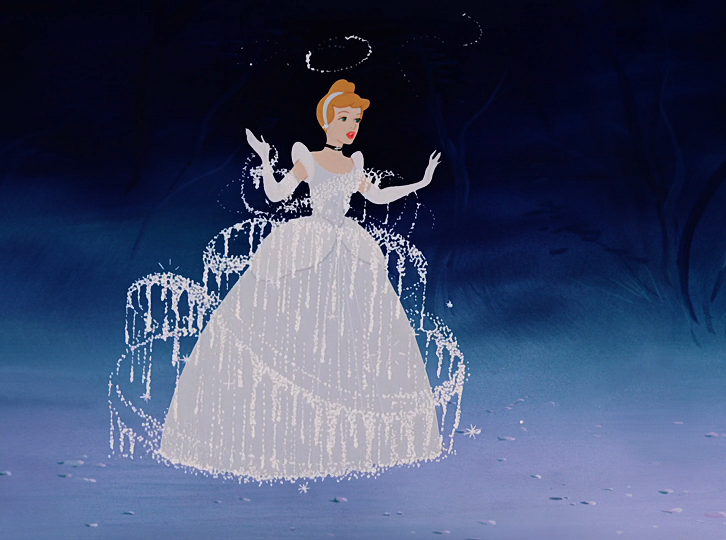 周囲の人々の命じるまま、働き続けるシンデレラ。妖精のおばあさんが「ビビディ・バビディ・ブー」という呪文とともに魔法の杖を一振りすると、たちまちカボチャは壮麗な馬車に、ボロボロの服は光り輝くドレスに変わり、シンデレラはあこがれの宮廷舞踏会に出かけていきます。しかし夢のような時間は、深夜12時になった途端、魔法が解けて終わってしまうのです…。
