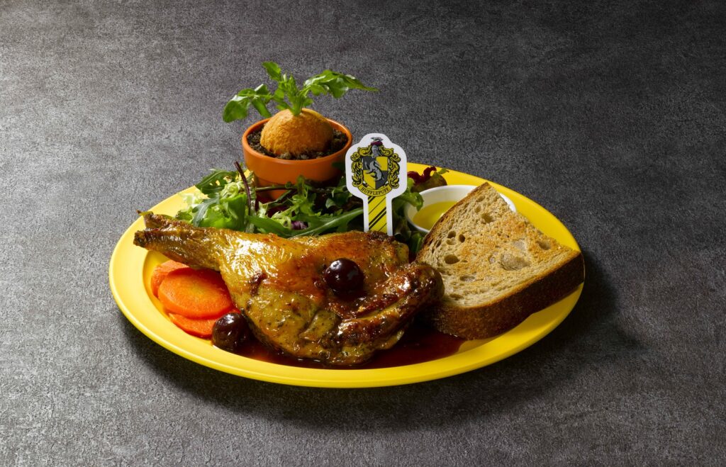 ハッフルパフ寮の寮長であり薬草学が担当のスプラウト先生をイメージし、ハーブでローストしたチキンレッグに、温室の植木鉢をイメージしたチーズボールとマッシュポテトを添えました。料理に使用されているピックは、本好きの「ハリー・ポッター」ファンに喜んでもらえるように、ブックマークとしてお持ち帰り頂けます。
