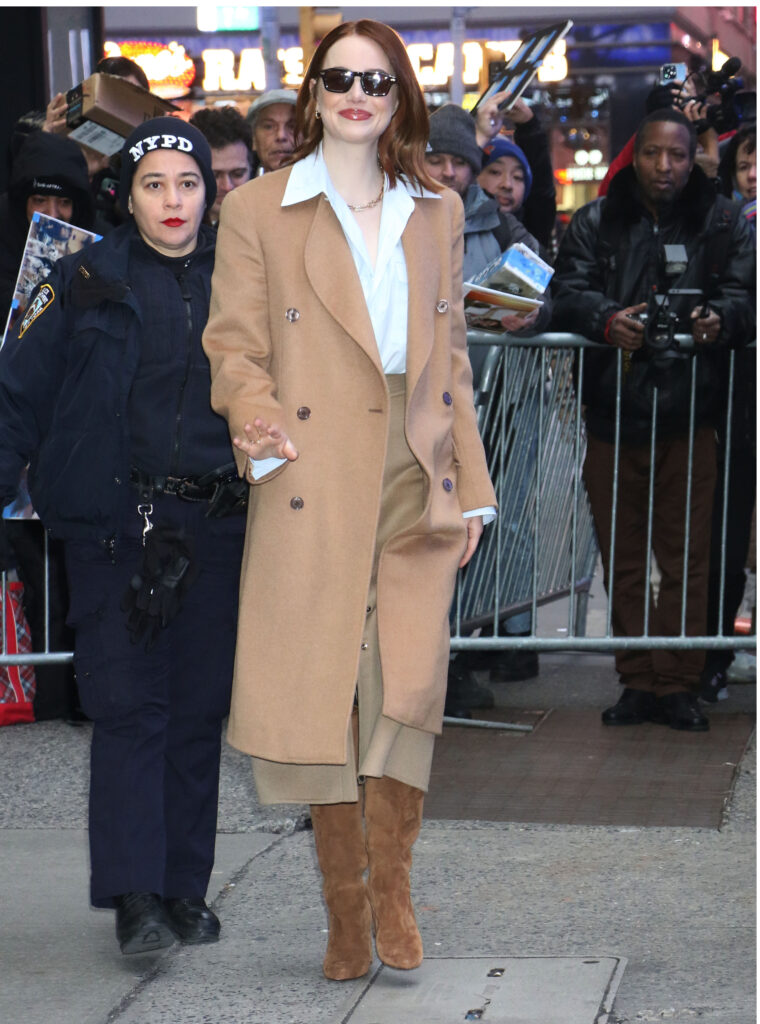 映画 『哀れなるものたち』で第81回ゴールデングローブ賞主演女優賞を受賞し、第96回アカデミー賞®主演女優賞にノミネートされているエマ・ストーン。連日のテレビ出演のため、ニューヨークに滞在中、さまざまなファッションをパパラッチされた。