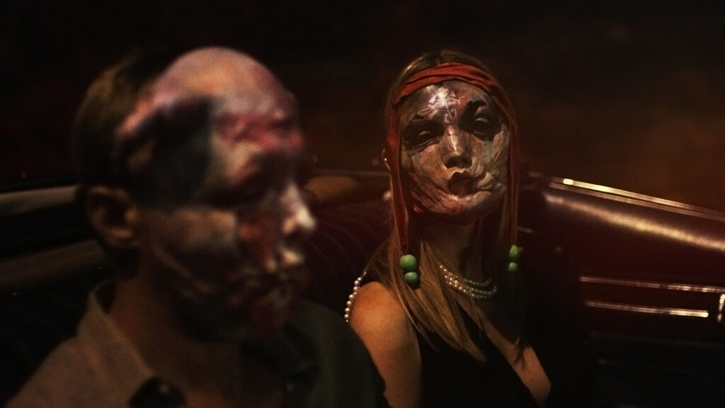 「お面がすごく怖くて、最初のシーンでぎょっとしました。人の顔が崩れたようになっているのは意味がありますか?」と聞かれると、「仮面の顔が崩れていること自体には意味はありません。カーニバルや東欧のお祭りで、人は仮面をつけることで、2つ目のアイデンティティを得て、普段はできないことができてしまいます。本作の仮面はシンボリズムとして使ったのではなく、こういった伝統にのっとっています。特殊なリ・トルカ島ならではの文化と伝統的な文化を表したいと思い、デザインはリチャード・ラーフォーストにお願いしました。彼はコンセプトアーティストで、映画作家で、漫画アーティストでもあります。映画『武器人間』の監督として知られていますね。最初から、彼は本作の視覚的なイメージの中心人物になると感じていましたし、本当に素晴らしいデザインをしてくれました」と答えた。