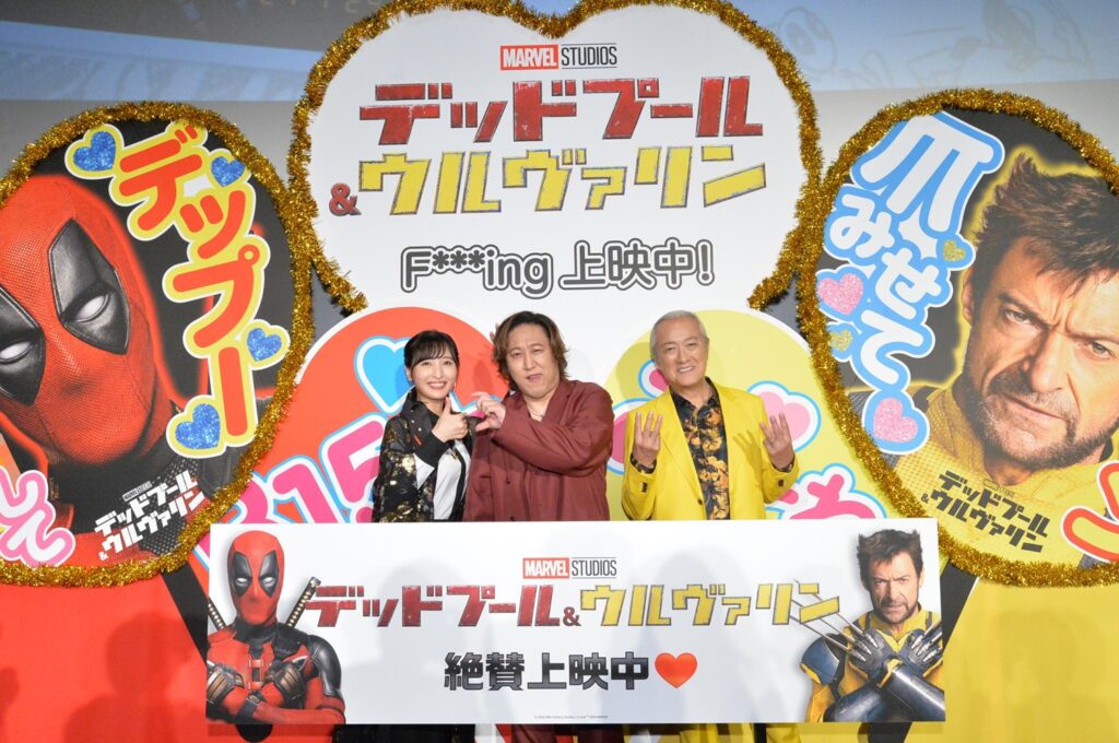 デッドプール役の加瀬は赤いスーツで登壇し「オープニングからぶっ飛ばしてますので肩肘張らずにぜひ楽しんでください。僕も山路さんも映画の中でおしゃべりしてる感じでした」と最新作公開への想いを語り、ウルヴァリンカラーの黄色いスーツで登壇した山路は「ある意味無茶苦茶な映画になってます。昨日映画館で観て、ところどころで散りばめられているネタへの反応が小気味よかったです。楽しんでください」、佐倉は「スキンヘッドのドSヴィランが正直私の声でいいのかなと思ってました。精神攻撃を仕掛けてくる敵なのでお気をつけてお楽しみください」とキャラクターへの想いも込めて挨拶。ステージにはそれぞれの巨大推しうちわが飾られる中、キャラクターの推しポイントを聞かれると、「デッドプールのマスクが好きなんですよね。あとは無責任ヒーローと言われるほどのテキトーさ、だけど強い、死なない…なんでもありで全てが詰まってます。全推しです」(加瀬)「(ウルヴァリンの推しうちわに書いてる)“爪みせて”大好きなんです。案外恥ずかしがりやでお茶目、可愛ところも推してます」(山路)「カサンドラは存在自体がネタバレなので…SNSではカサンドラがASMRっていう意見があって。そう聞こえる部分もカサンドラが仕掛ける精神攻撃に繋がっているのかもしれません。特に映画館の良い音響だと聞こえやすいのかな」(佐倉)とキャラクターへの推しポイントを力説。毒舌&テキトーで下ネタも喋りまくり、第四の壁を越えて観客も話しかける、デッドプールのおしゃべりな姿は本作でも健在しており、加瀬は「デッドプールを演じると何週間か何もできなくなるんです。全てを使い果たさないとできないので。シリーズを通じてセリフ量も増え続けていますが、みなさんには楽しんでもらいたい、というせめぎ合いがこの先もずっと続くんだなと思ってます」とデッドプールならではの苦労を明かした。